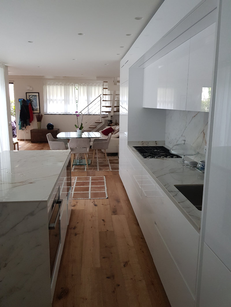 Il progetto ha riguardato la ristrutturazione intergrale dell’appartamento realizandu due nuovi bagni, uno al piano ingresso, nella zona giorno, e uno al piano superiore per la camera padronale. La creazione di un grande opens space al piano terra con cucina a isola e un soggiorno, mentre al piano superiore sono stete ricavate due camere da letto e un soggiorno privato.