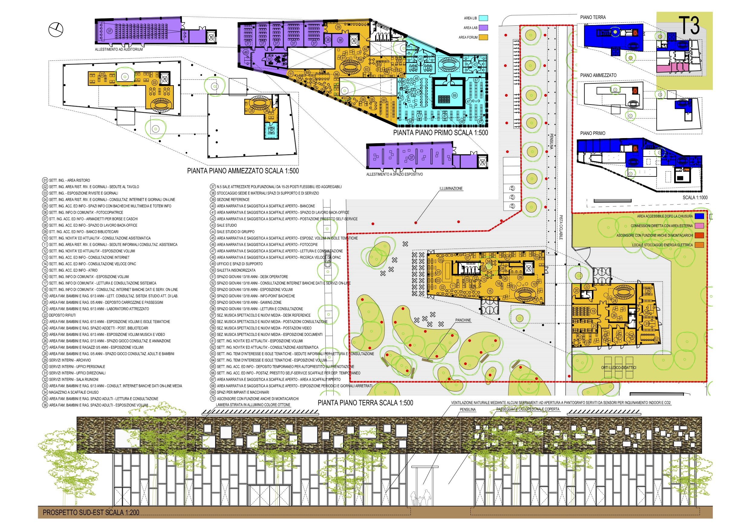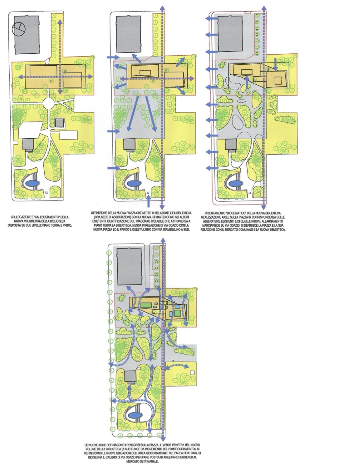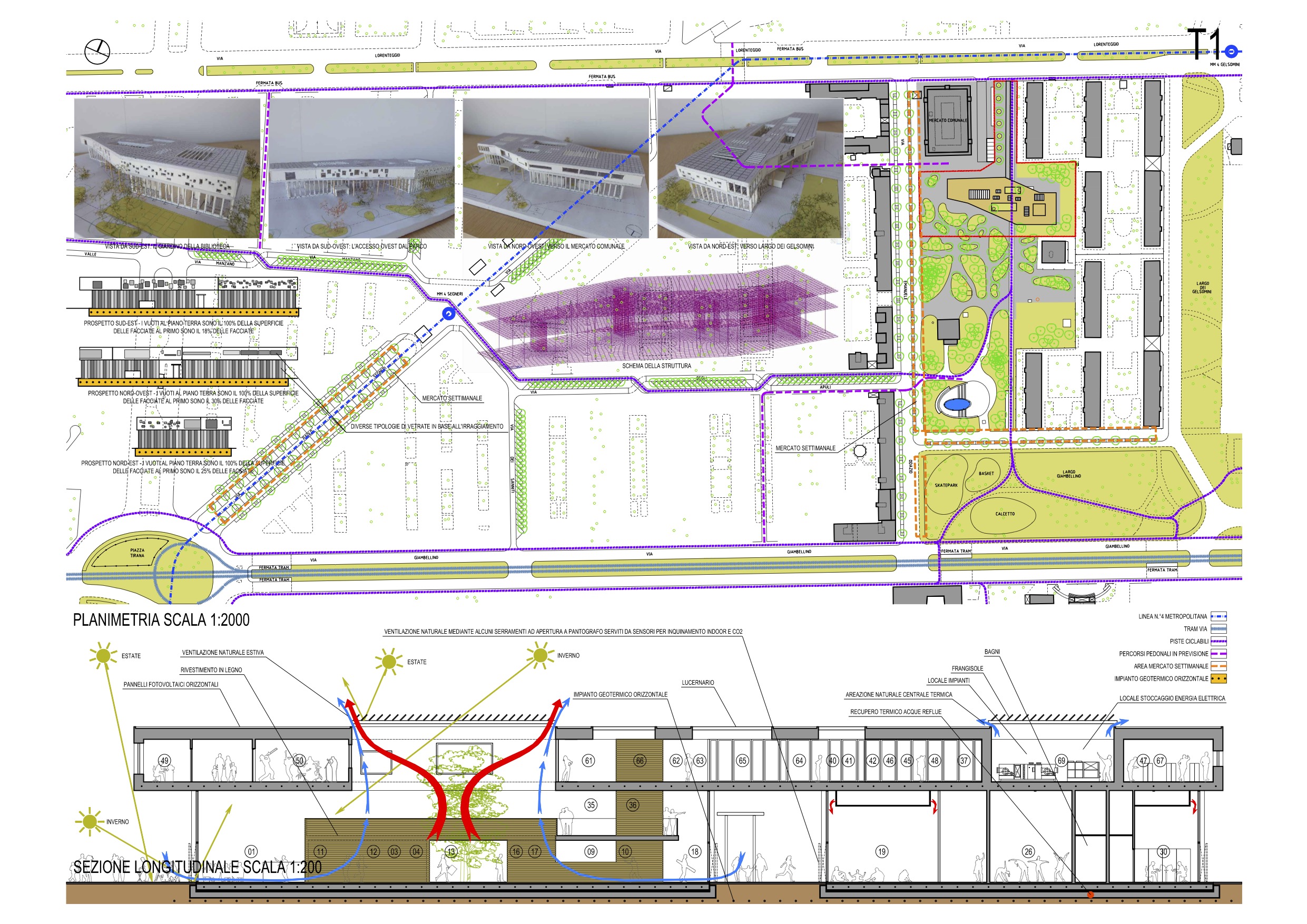 Il progetto è caratterizzato da una forte integrazione della Biblioteca con il Parco ed il sistema di percorsi ciclopedonali con l’obbiettivo di creare coesione sociale. La Biblioteca si pone come “libro aperto” sulla città, un edificio poroso, una connessione ciclopedonale in direzione nord-sud attraversa il parco e la stessa biblioteca. Due volumi completamente vetrati, con valori di trasmittanza prossimi a quelli di pareti opache, definiscono il piano terra. Due scale panoramiche consentono l’ascesa al più articolato secondo livello, un volume rivestito da una lamiera stirata colore ottone, che riflette la luce solare, caratterizzato da pieni e vuoti che suddividono il grande open-space. I principali materiali utilizzati sono: legno, calcestruzzo, acciaio e vetro; lo strumento operativo utilizzato è il Life Cycle Thinking “LCA”. Per l’eliminazione completa di gas radon si adottano sistemi passivi. Il progetto prevede di collegare il “quartiere Lorenteggio” alla nuova biblioteca attraverso la ridefinizione dell’asse di Via Odazio rimodulandone il calibro stradale (pur mantenendo il doppio senso di marcia) a favore di una maggiore “pedonalizzazione” di cui beneficia il mercato settimanale, qui collocato, facilitando il rapporto con via degli Apuli (unico asse viario di penetrazione nel quartiere IFACP). La caffetteria, la zona d’ingresso ed accoglienza e l’”area forum” in genere sono catalizzate da una grande “piastra” che costituisce la piazza urbana che le mette in relazione con il mercato comunale e con la nuova sede di Associazioni. All’interno della “piastra” sono ricavate delle “isole verdi” che perimetrano e raggruppano gli alberi esistenti e nuovi, più ampie e compatte a sud, mentre in prossimità della biblioteca lasciano spazio alla piazza. Gli alberi esistenti, posti in corrispondenza della biblioteca, la attraversano dando luogo a patii e cavedi in quota che disegnano la copertura piana caratterizzata da lucernai e pannelli fotovoltaici piani. Il parcheggio del mercato comunale ad est è stato spostato lungo la via Odazio, al suo posto una pensilina “ciclopedonale” crea un percorso “dolce” da via Lorenteggio alla nuova biblioteca. Il nuovo edificio si compone di due livelli. Il piano terra è costituito da due volumi (di circa 6 metri di altezza) interamente vetrati e “permeabili” con spazi a doppia altezza. Il primo piano, costituito da un unico più ampio e compatto volume (meno del 35% delle facciate sono costituite da finestre) dalla forma irregolare (di circa 4 metri di altezza) che collega il piano terra. Alcuni lucernai disegnano la copertura piana. Nonostante la biblioteca sia “immersa nel verde”, l’ampia superficie a sbalzo del primo piano le da una grande visibilità anche da lontano e da luogo ad una “piazza coperta”. La struttura portante è costituita da elementi in c.a. gettato in opera. I due impalcati sono in soletta piena, le strutture in elevazione sono costituite da pilotis (che ricordano gli alberi) e setti come irrigidimento orizzontale. Prioritario è il requisito di non utilizzare energia, si punta all’efficienza energetica NZEB. l’involucro dell’edificio è inteso quale sistema principale per la produzione ed il mantenimento dell’energia. Gli impianti, tecnologicamente avanzati, sfruttano le fonti rinnovabili. Il sistema di tamponamento esterno è costituito da blocchi di cemento autoclavato, abbinato ad isolanti fibrosi in lana di legno nella controparete interna, finita con doppia lastra di cartongesso. Una serie di altri componenti, come i solai totalmente in calcestruzzo e le pareti interne a secco (cartongesso), permettono di gestire i carichi di punta, sia degli apporti calorici dovuti alla presenza di persone che quelli solari, per cui l’edificio diventa una grande spugna che assorbe calore di giorno mentre la notte viene rilasciato all’interno degli ambienti. Un sistema elettronico gestisce le temperature interne ed esterne con differenziale di pressione, che consente l’apertura automatica delle finestre generando ventilazione naturale per effetto camino. Altro accorgimento utilizzato è l’attivazione termica della massa (thermal slab) che sfrutta la capacità di accumulo termico del solaio in calcestruzzo e della platea di fondazione. Le tubazioni sono annegate nei solai che contribuiscono alla climatizzazione, asportando calore per raffrescare o cedendo energia termica per riscaldare. Per i fabbisogni di energia primaria si è verificato, con un programma di simulazione dinamica, il comportamento dell’edificio nelle 4 stagioni; per le grandi vetrate del piano terra, sarà predominante l’utilizzo di vetrate con basso fattore solare in modo da ottimizzare al massimo gli apporti solari durante il periodo invernale, mentre per il periodo estivo le vetrate, che sono dotate di “pinne” verticali fisse insieme agli gli aggetti garantiscono l’ombreggiamento. L’impianto di climatizzazione con aria primaria è suddiviso per ambienti ed è modulabile in funzione del fabbisogno richiesto.