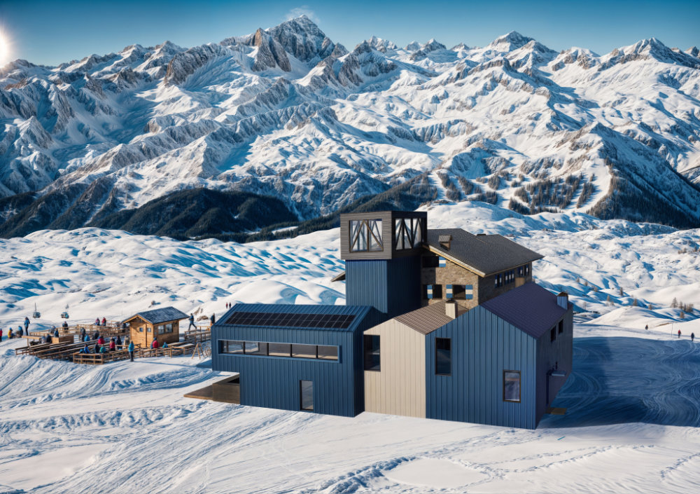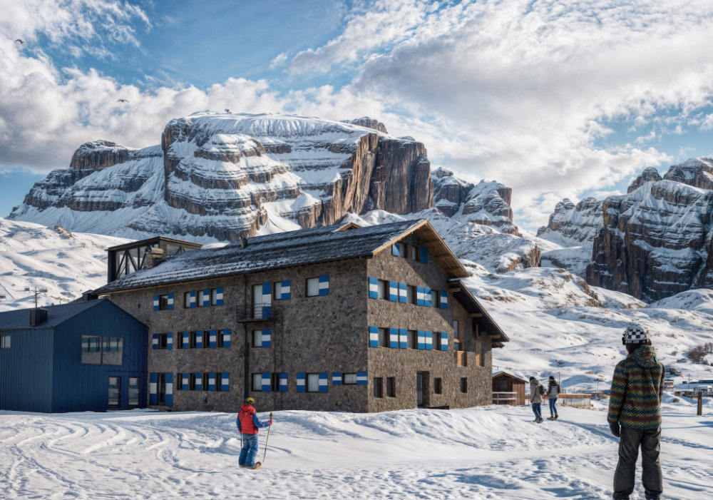 I nuovi volumi, dalle linee essenziali e contemporanee, rivestiti in doghe verticali di lamiera, sono facilmente riconoscibili da chi raggiunge il rifugio in quanto di colore azzurro, tranne l’area self-service di colore bianco, a simboleggiare le persiane (azzurre e bianche) che caratterizzano i rifugi S.A.T.