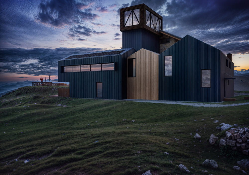 Il vano della nuova scala principale è rivestito da lamiera di colore azzurro ed è coronato da un “belvedere” in lamiera, (dello stesso colore grigio del tetto esistente), e da vetrate sui quattro lati. Questo volume ricorda una “torre di avvistamento”, e diventa un “punto cospicuo” per chi, arrivando da lontano, identifica in questo modo più facilmente il rifugio, grazie anche alla luce che emanano le sue ampie vetrate all’imbrunire. Il “belvedere” funge da punto privilegiato con vista a 360° sulle montagne circostanti per chi si trova al suo interno grazie alla sua posizione elevata rispetto agli altri volumi.