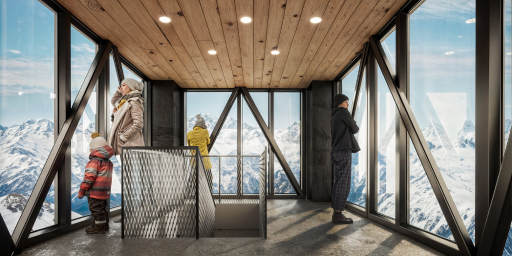 Il “belvedere” interamente vetrato, posto a coronamento del volume della scala principale, è il confortevole luogo di contemplazione delle montagne nel silenzio della natura circostante fino a sera, momento in cui si trasforma in “faro” luminoso.