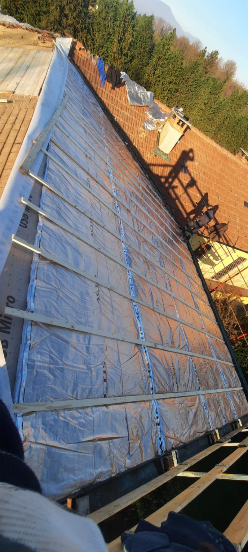 Il progetto riguarda il rifacimento della coibentazione del tetto e del manto in tegole oltre che il rifacimento della facciata.